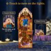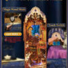Khung cảnh một thư viện huyền bí với các giá sách nhỏ xinh được tái hiện tinh tế từ gỗ tự nhiên cao cấp. Các chi tiết như ngọn đèn bụi phủ, các đầu sách cổ được khắc họa rõ nét tạo nên bầu không gian đậm chất cổ điển. Một cửa kính phản chiếu ảo thuật mang đến cảm giác sống động khó tin. Khi ánh sáng LED bật lên qua cảm ứng chạm nhẹ sẽ làm nổi bật từng chi tiết tinh xảo.
