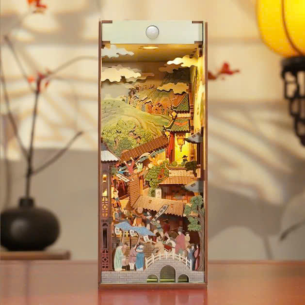 Hệ thống đèn LED tinh xảo, tạo hiệu ứng ánh sáng rực rỡ như chính thành phố thật trong ánh hoàng hôn. Ánh sáng ấm áp làm nổi bật từng chi tiết, từ dòng sông lấp lánh đến những mái nhà cổ kính.